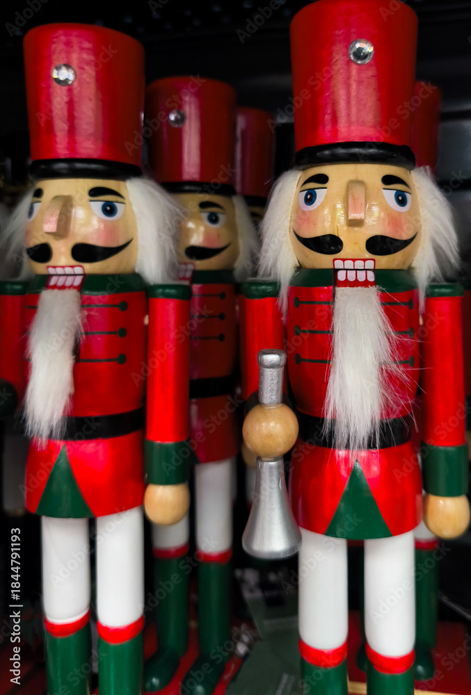 Close-up with decorative wooden nutcracker dolls. These figurines have a German tradition