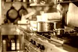 Stovetop with stainless steel saucepans on lit gas burner against blurry background of restaurant kitchen