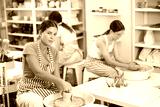 Young woman teacher and two girl students sculpt ceramic products on pottery wheel