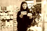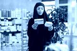Young woman buyer in hijab chooses box of pills in pharmacy