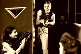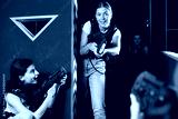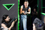Team of young girlfriends play laser tag in a labyrinth. Girls spend time actively