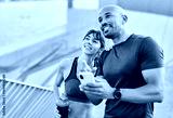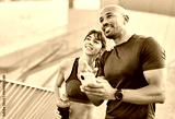 Smiling active young couple jogging exercising and having fun and laughing together taking a breakand using a mobile phone after walking and running in the park, fitness and healhty living concept