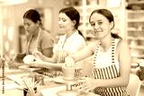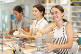 Teen girl student sculpting bowl of gray clay, smoothing surface of clay product with fingers and cutter. Handmade manufacturing from clay, hobby and leisure activity