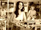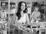 Portrait of female shopper with cart cheese and meat choosing food and wine in grocery department of supermarket
