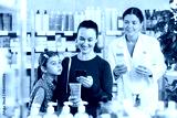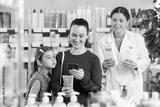 Glad mother with little girl controlling QR-code of cream, woman apothecary helping her in drugstore