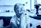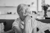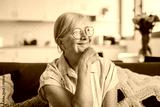 Elderly woman sitting on a sofa at home smiles as she looks out the window. She enjoys a peaceful and reflective moment, embracing a calm and cozy domestic lifestyle.