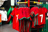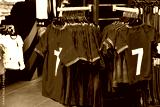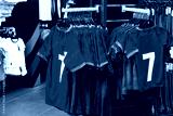 Red and green sports jerseys with number seven displayed on hangers in a retail store, showcasing vibrant colors and athletic apparel for fans and players