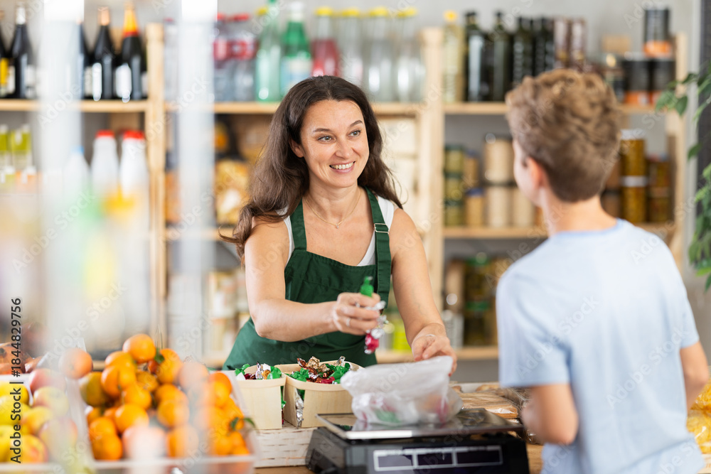 Adult woman seller weighs and sells sweet candies to boy buyer in grocery store