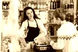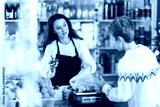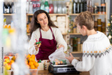 Adult woman seller weighs and sells sweet candies to boy buyer in grocery store decorated for christmas