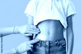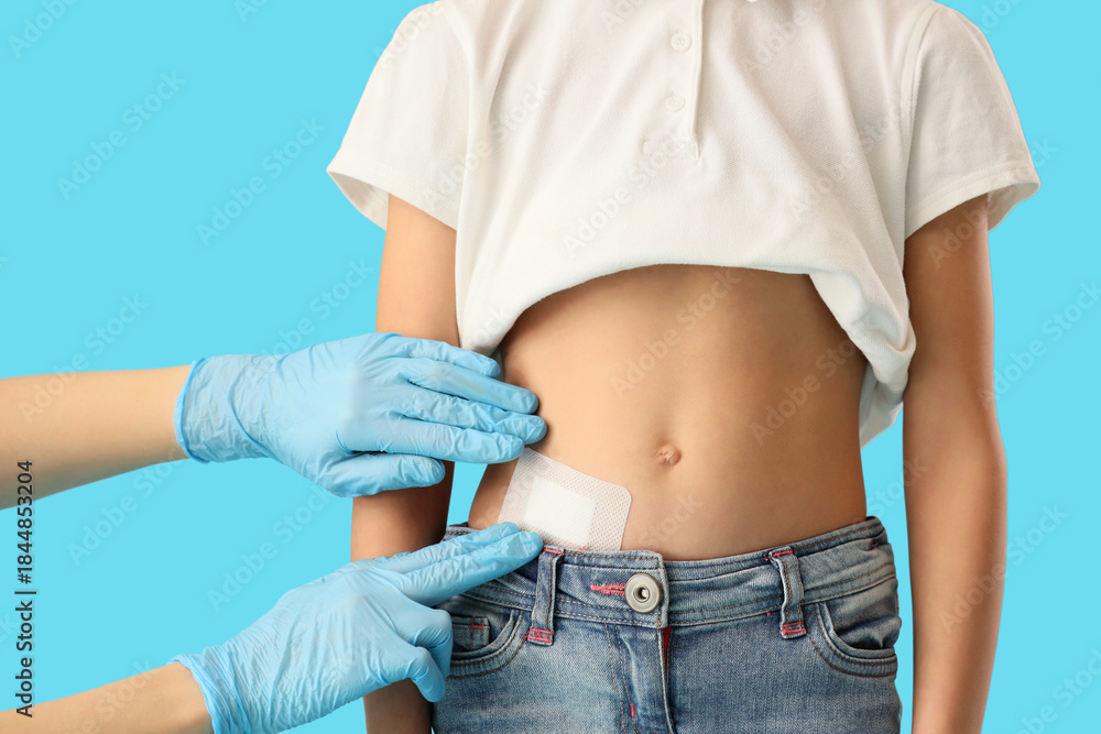 Doctor applying medical patch on girl's belly after appendectomy surgery against blue background, closeup