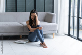 Sad woman with fat upset bored of dieting Weight loss fail Fat diet and scale sad asian woman on weight scale at home weight control..