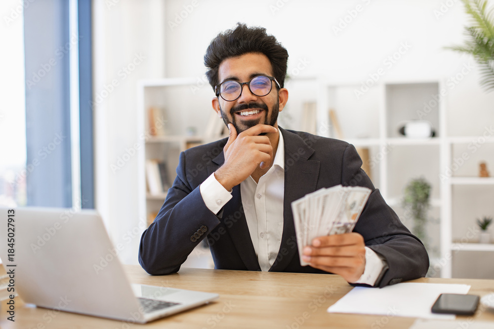 An Indian businessman smiles while holding a wad of cash, looking pleased with his financial success