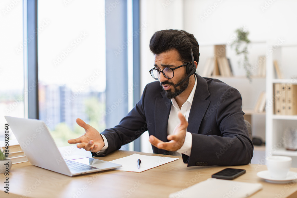 An Arab businessman gestures while participating in a video conference call using a headset and laptop