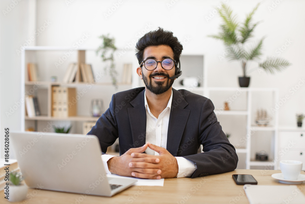 An Indian businessman wearing a headset smiles while working at his desk in a modern office setting
