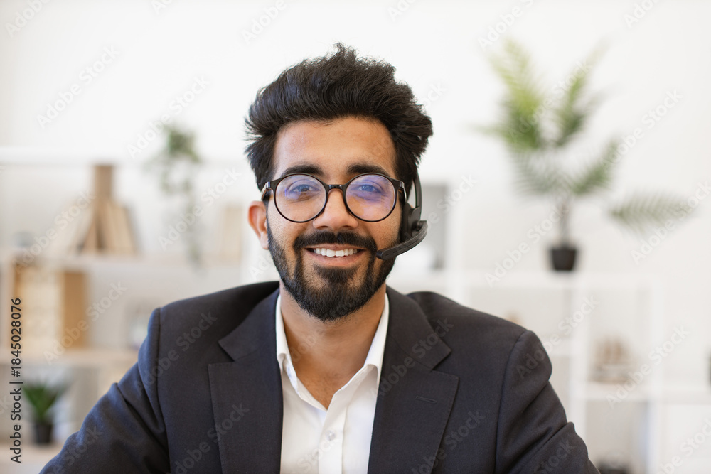 An Indian businessman wearing a headset smiles at the camera, ready to assist customers or colleagues