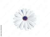 Close up shot of a white African daisy flower with a dark blue purple center.