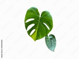 Fresh green Monstera Deliciosa leaf with yellow variegation and holes isolated on white background.
