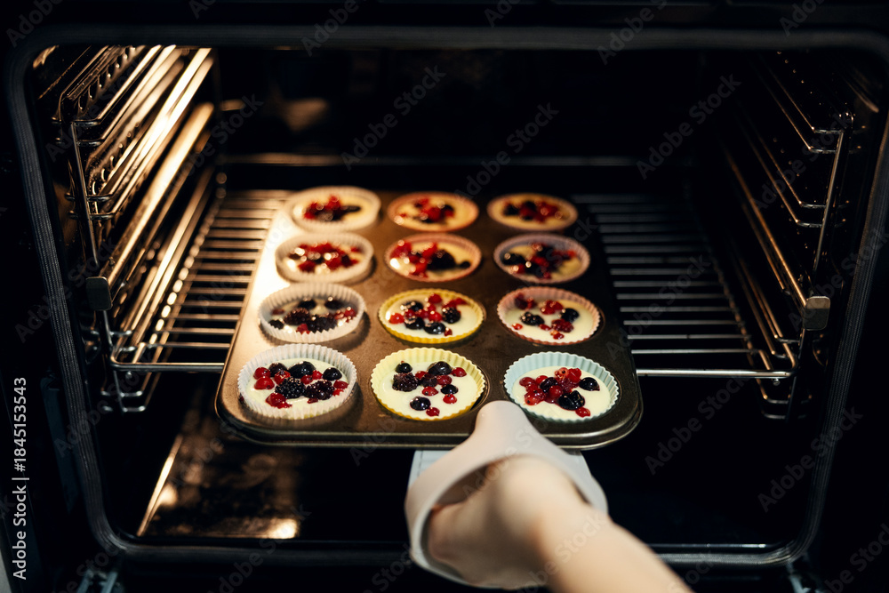 Baking berry muffins in hot oven for dessert