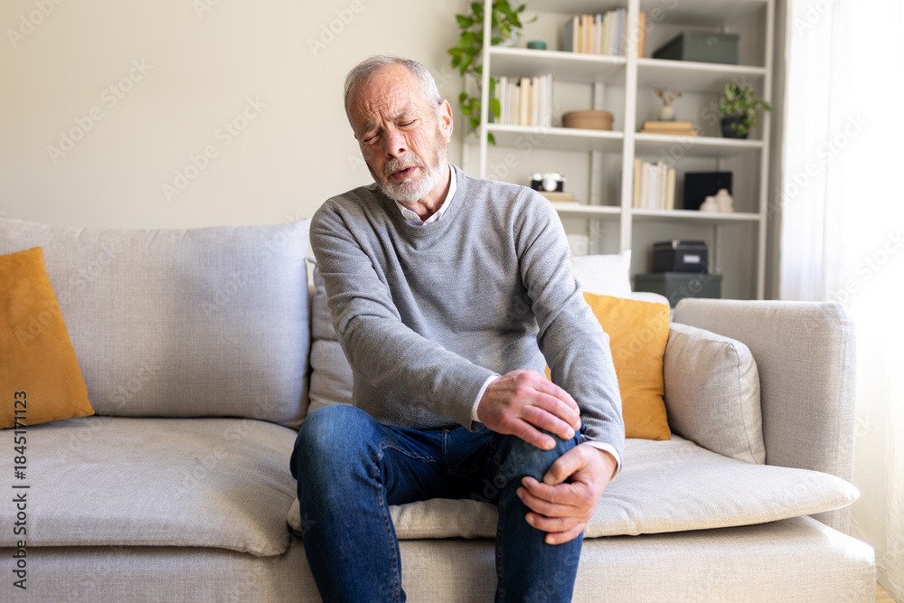 Senior man experiencing knee pain while sitting on sofa at home