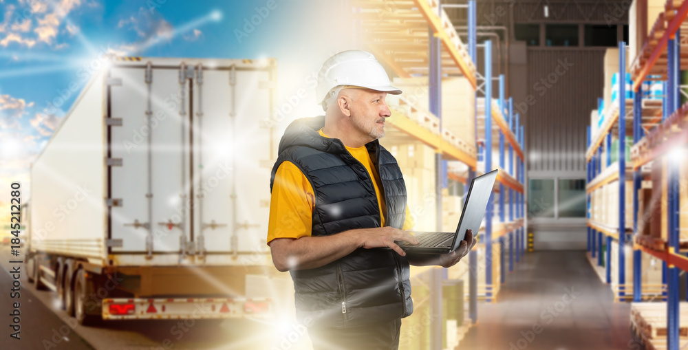 Logistics coordination specialist tracks cargo flow on a laptop between warehouse racks and an outbound truck, ensuring accurate shipment management and timely delivery.