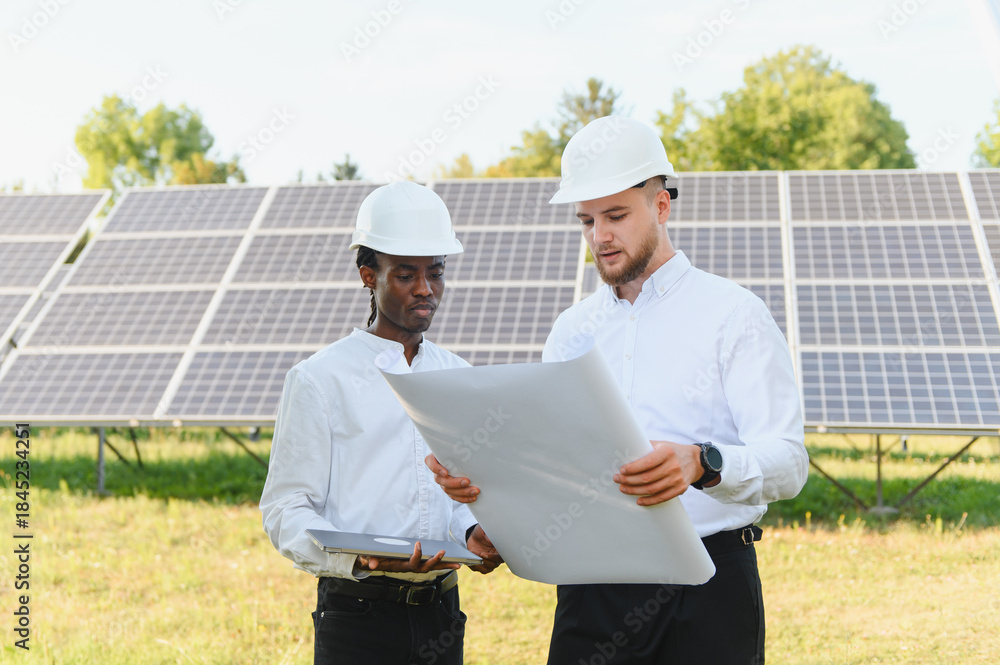 Engineers discussing solar panel blueprints at renewable energy farm