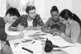 Team, students and reading book in college for education, knowledge or brainstorming together. University, group and people writing notes for information, learning and help for math exam in class