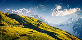 Wonderful summer view of alpine meadows at the foot of Tetnuldi peak. Stunning morning landscape of Upper Svaneti, Georgia, Europe. Beautiful outdoors scene of Caucasus mountains.