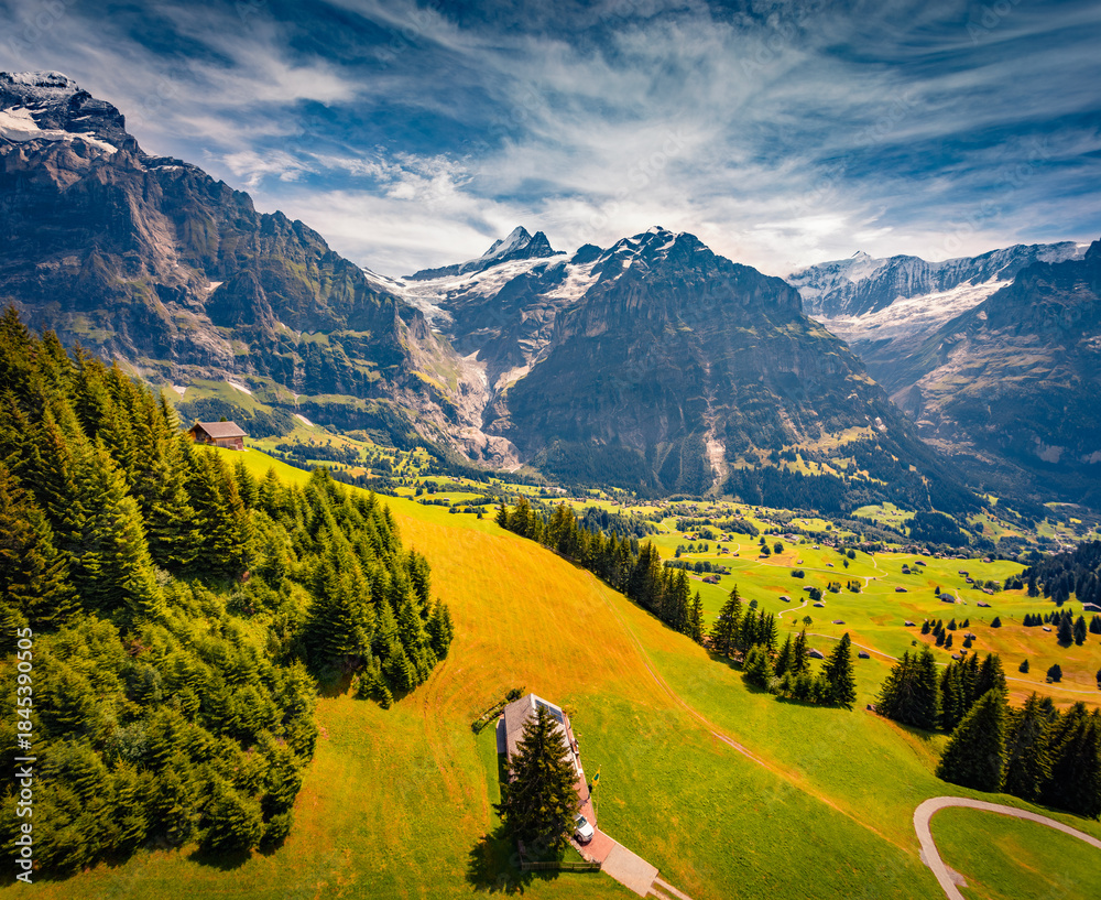 Majestic summer view of Grindelwald village from cableway cabin. Spectacular morning scene of Wellhorn peak, Innertkirchen in the Bernese Oberland Alps location, Switzerland, Europe.