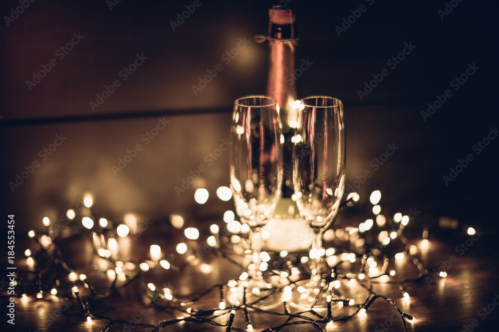 Bottle of champagne with two glasses and Christmas lights. Abstract background image.