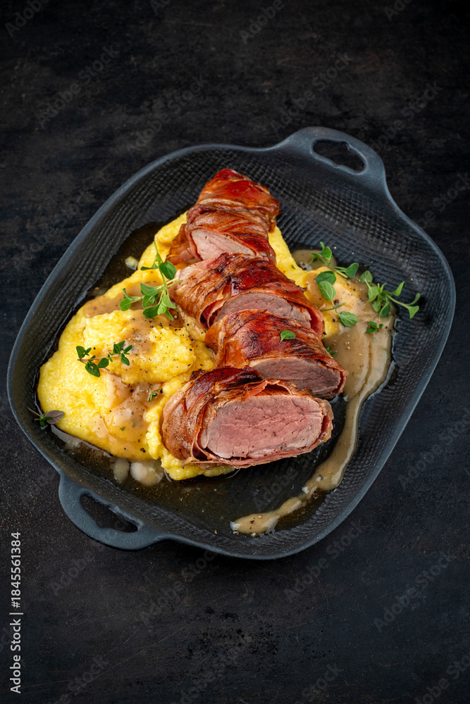 Pork fillet roast wrapped in prosciutto ham bacon with polenta and fresh herbs in serving cast iron skillet