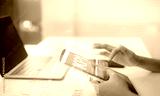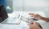 Business analytics concept showing KPI dashboard on smartphone with data charts and artificial intelligence interface over financial report for digital strategy data driven decision business growth
