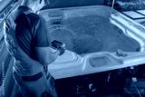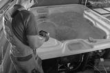 Worker Checks Hot Tub System With a Tablet in Backyard