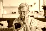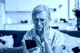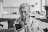 Elderly woman sits on a sofa at home looking at her phone with disappointment. She receives bad news while shopping online, feeling frustrated and cautious about digital transactions.