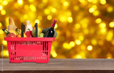 Shopping basket with products for holiday dinner on table against blurred lights. Space for text
