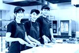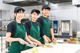 Kitchen, male and female cooks cutting cabbage in the back yard