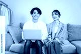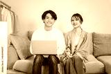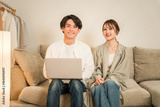 A young Asian couple sitting on the sofa in the living room and looking at a laptop