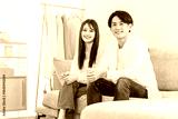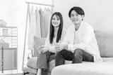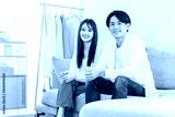 Young Asian couple sitting on sofa in living room at home