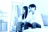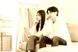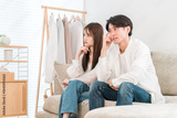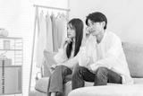 A young Asian couple discussing their worries while sitting on the sofa in the living room
