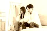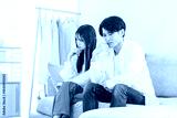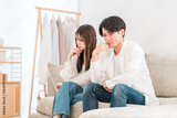A young Asian couple discussing their worries while sitting on the sofa in the living room
