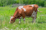 A Beautiful Brown Grazing Cow Relaxing Calmly in a Lush and Vibrant Green Field of Grass