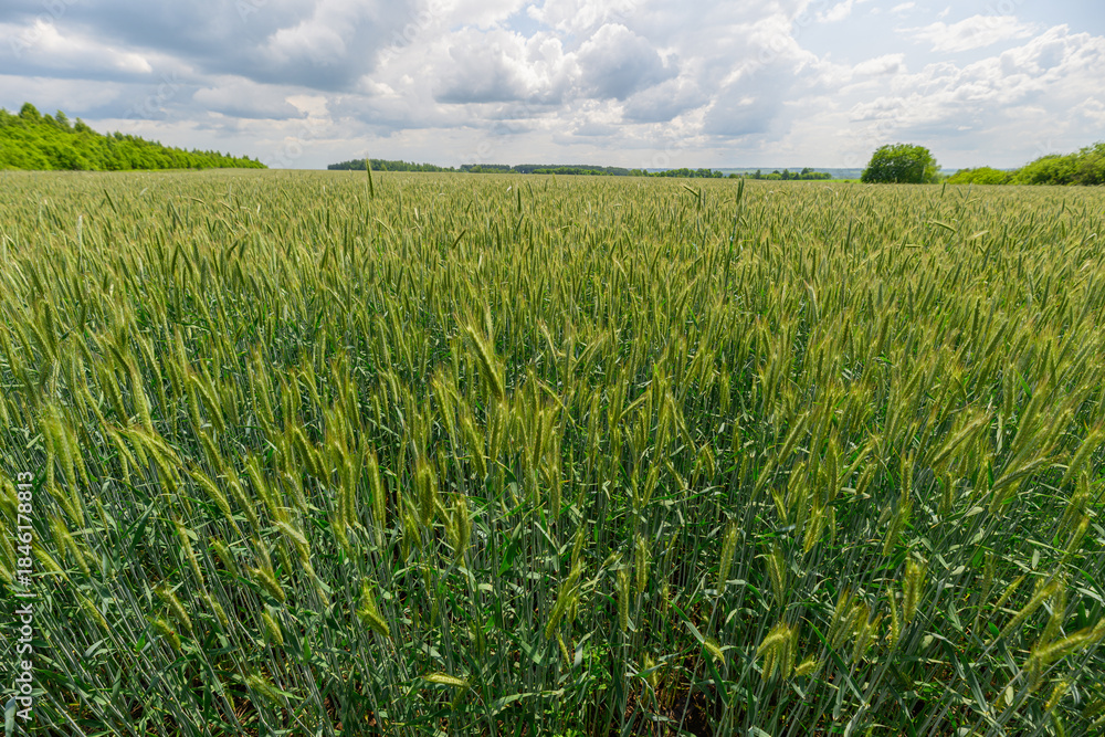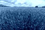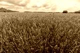 A beautiful and lush wheat field stretches wide under a dramatic, cloudy sky above it