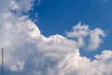 Fluffy white clouds drift gracefully across a bright and vibrant blue sky above us