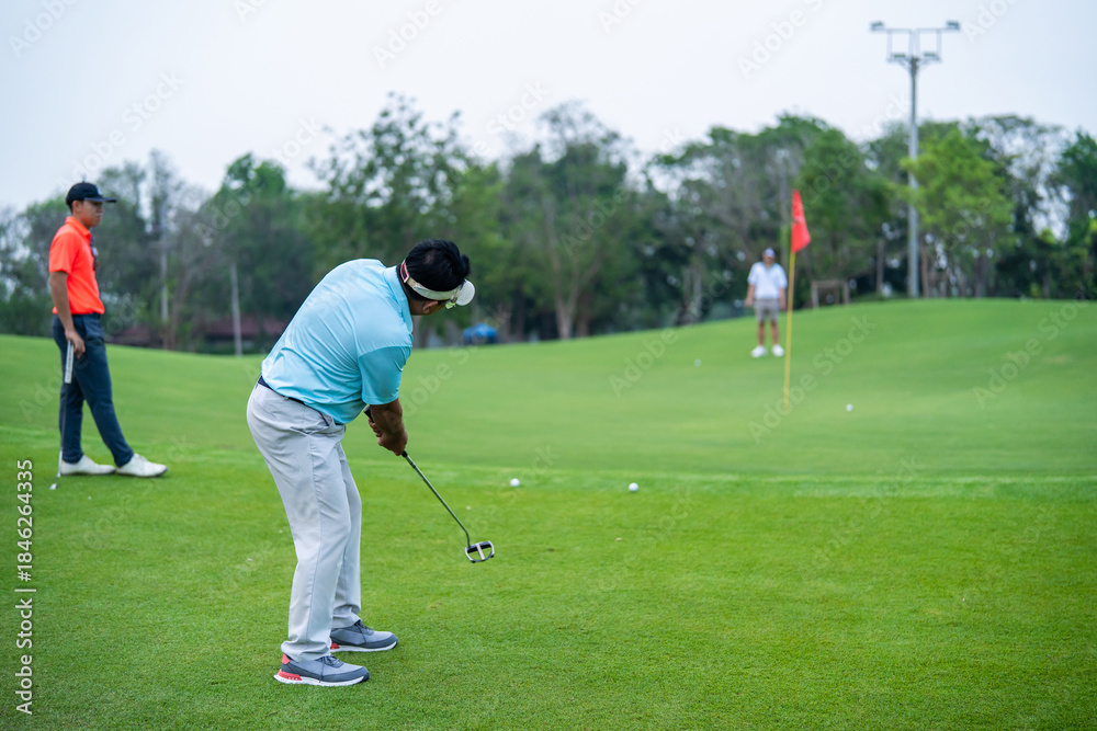 Group of professional male golfers swing clubs on scenic golf course.