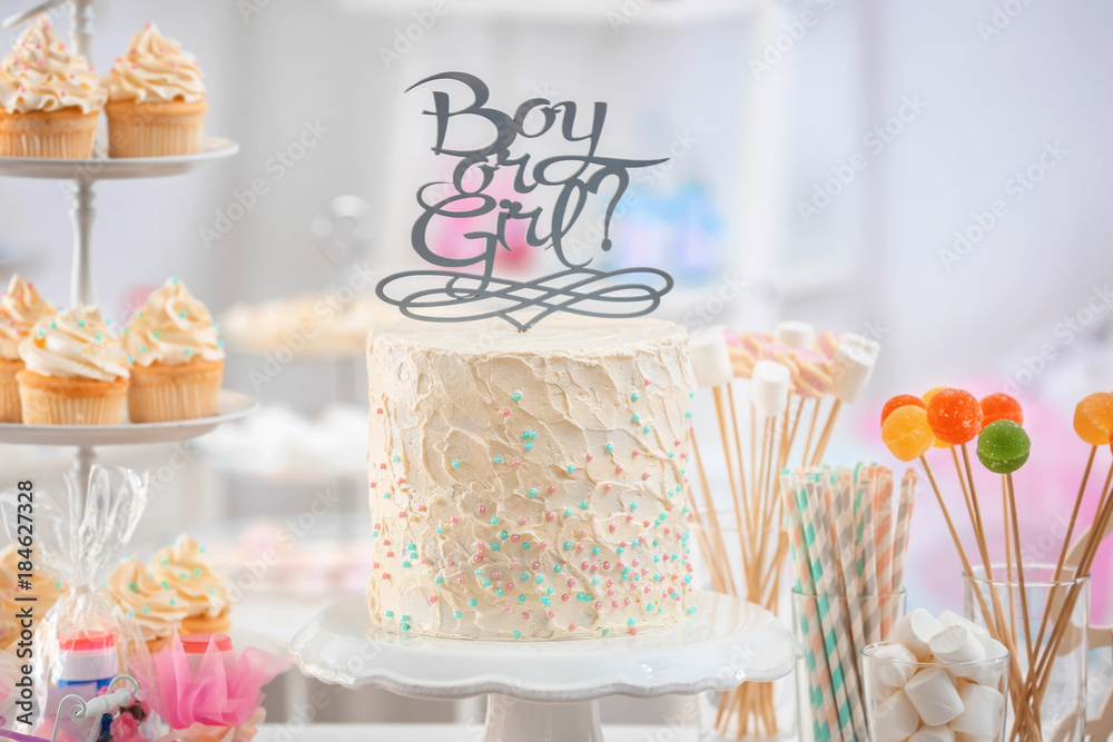 "Boy or girl" cake and different treats for baby shower party on table indoors