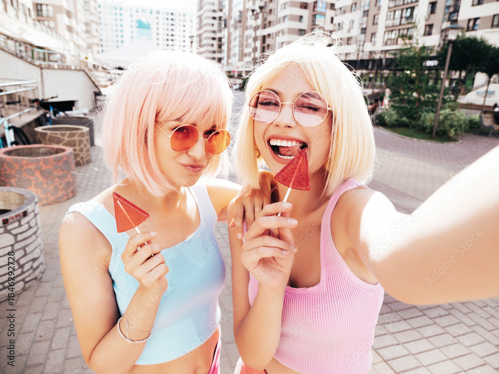 Two young beautiful smiling hipster female in trendy summer clothes. Sexy carefree women posing in the street in wigs. Positive funny models having fun at sunset. In sunglasses. Eating candy lollipop