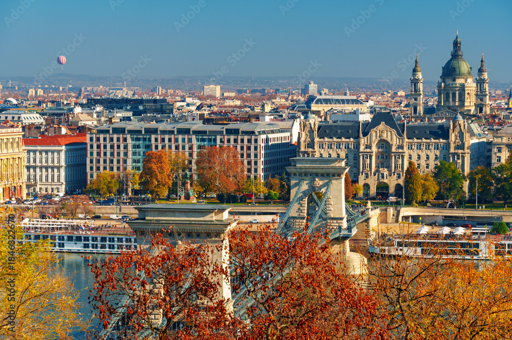 Budapest cityscape, panoramic view of city and Danube River with Chain bridge and beautiful architecture in autumn season, trees, branches and yellow leaves in foreground
