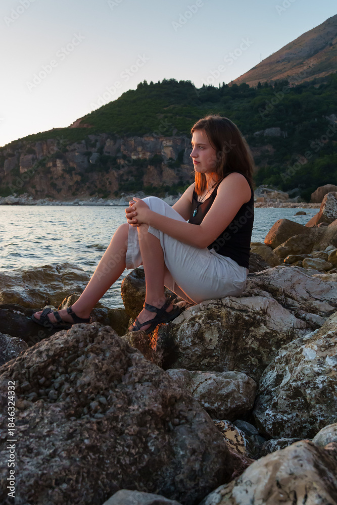 A girl poses and relaxes by the sea, on the rocks, a panoramic view of the coast and mountains at sunset, sunlight creates backlighting and silhouettes