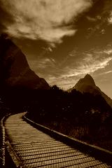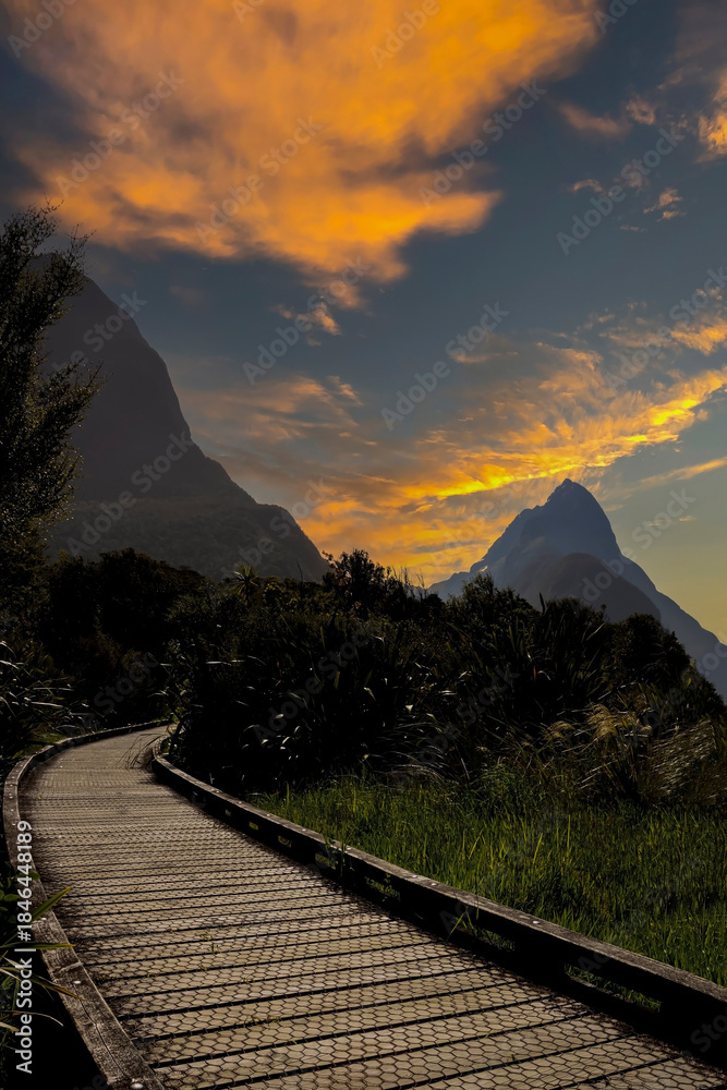 Vertical view boardwalk way with Mitre Peak, Milford Sound, New Zealand ,Fiordland national park