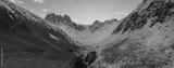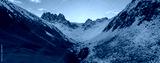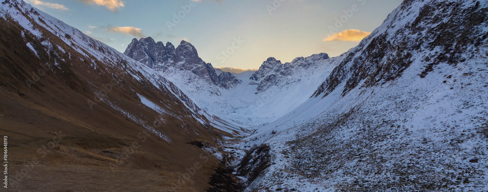 The mountain view of alpine as snow-capped mount peaks in Winter mountains scene background