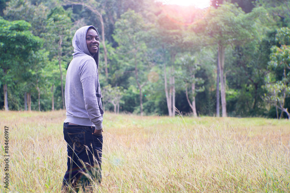 Freedom African Man standing with smile and happy at meadow and green forest with light flare.
